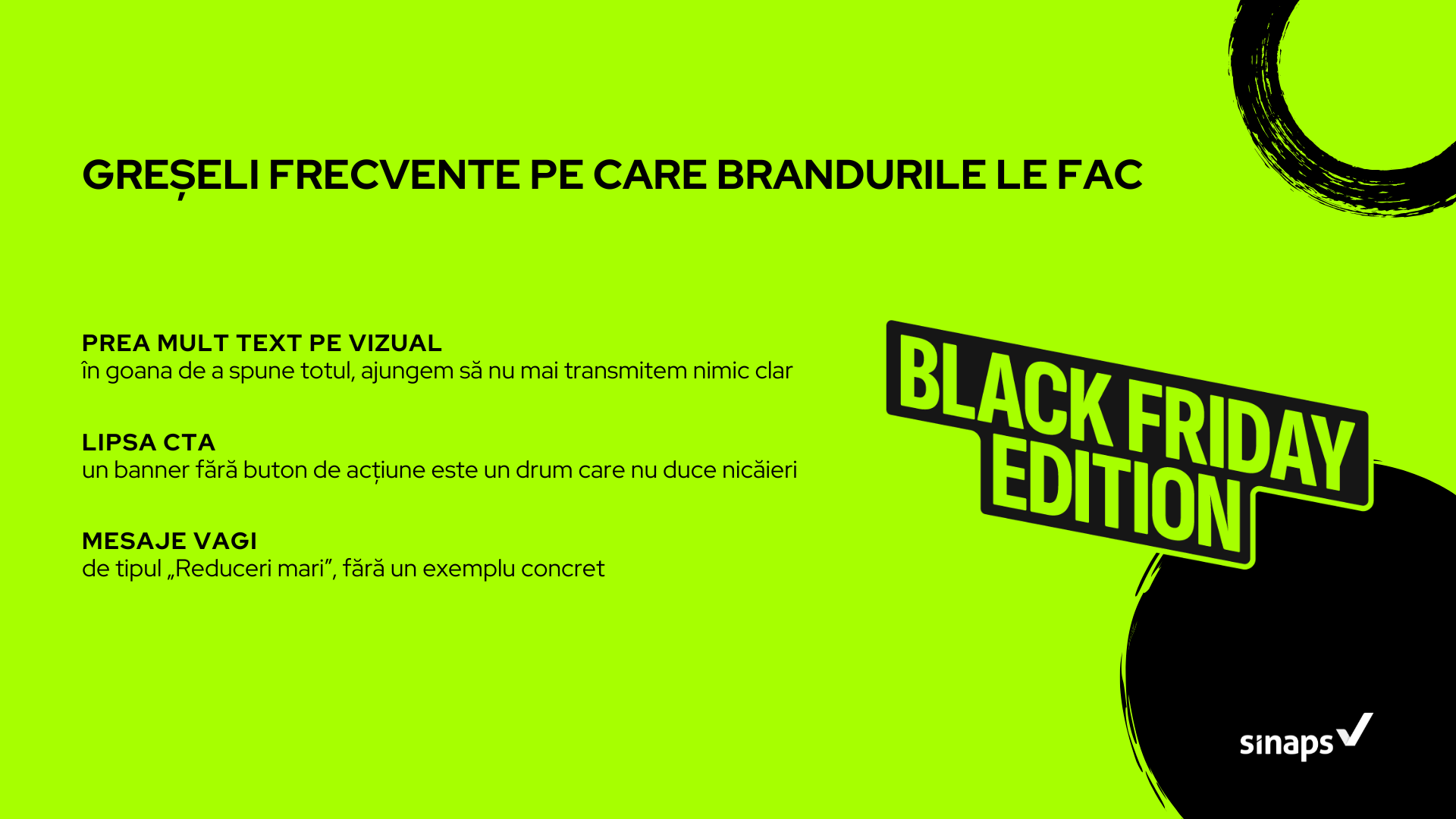 Greșeli frecvente care trebuie evitate: prea mult text pe vizual, lipsa CTA-ului și mesajele vagi, de tipul „Reduceri mari”, fără un exemplu concret.