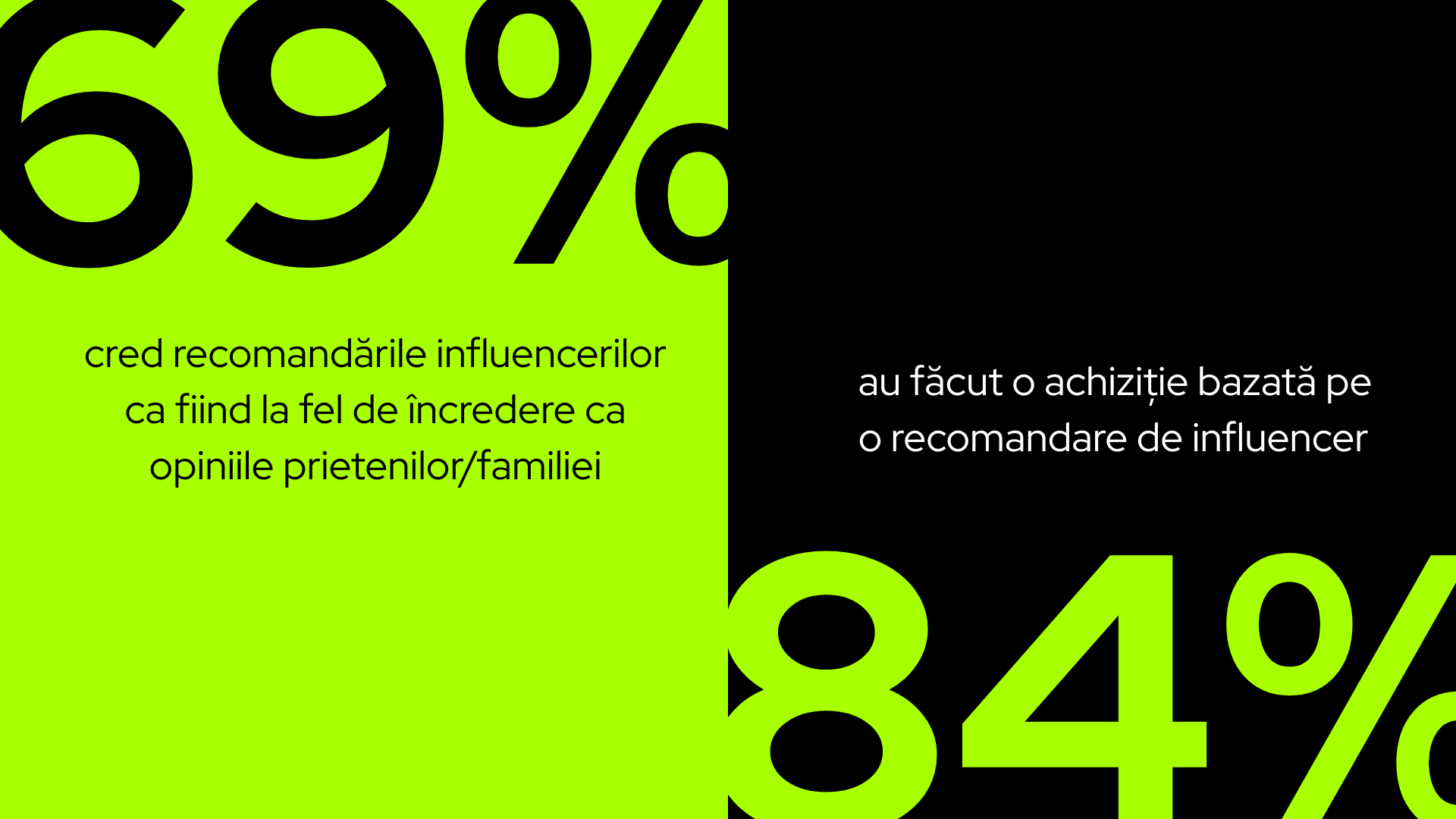 Peste 69% dintre consumatori cred recomandările influencerilor ca fiind la fel de încredere ca opiniile prietenilor/familiei, iar 84% au făcut o achiziție bazată pe o astfel de recomandare.